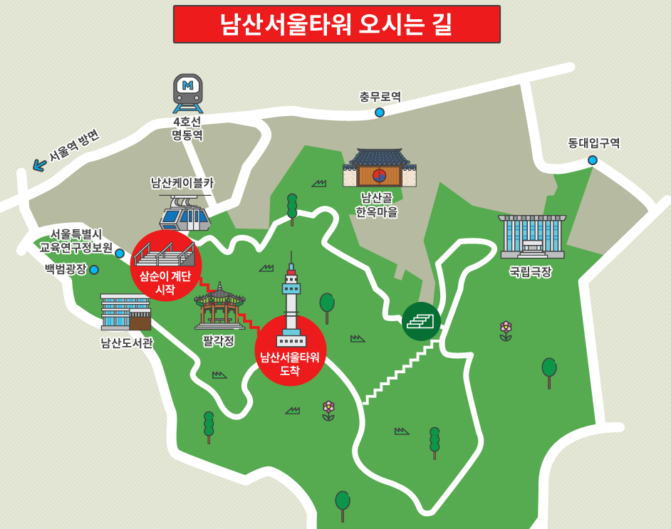 자가용 : 네비게이션 이용시 [남산케이블카]를 검색하세요 대중교통 : 명동역 3번출구에서 중국영사관 쪽으로 10분 거리